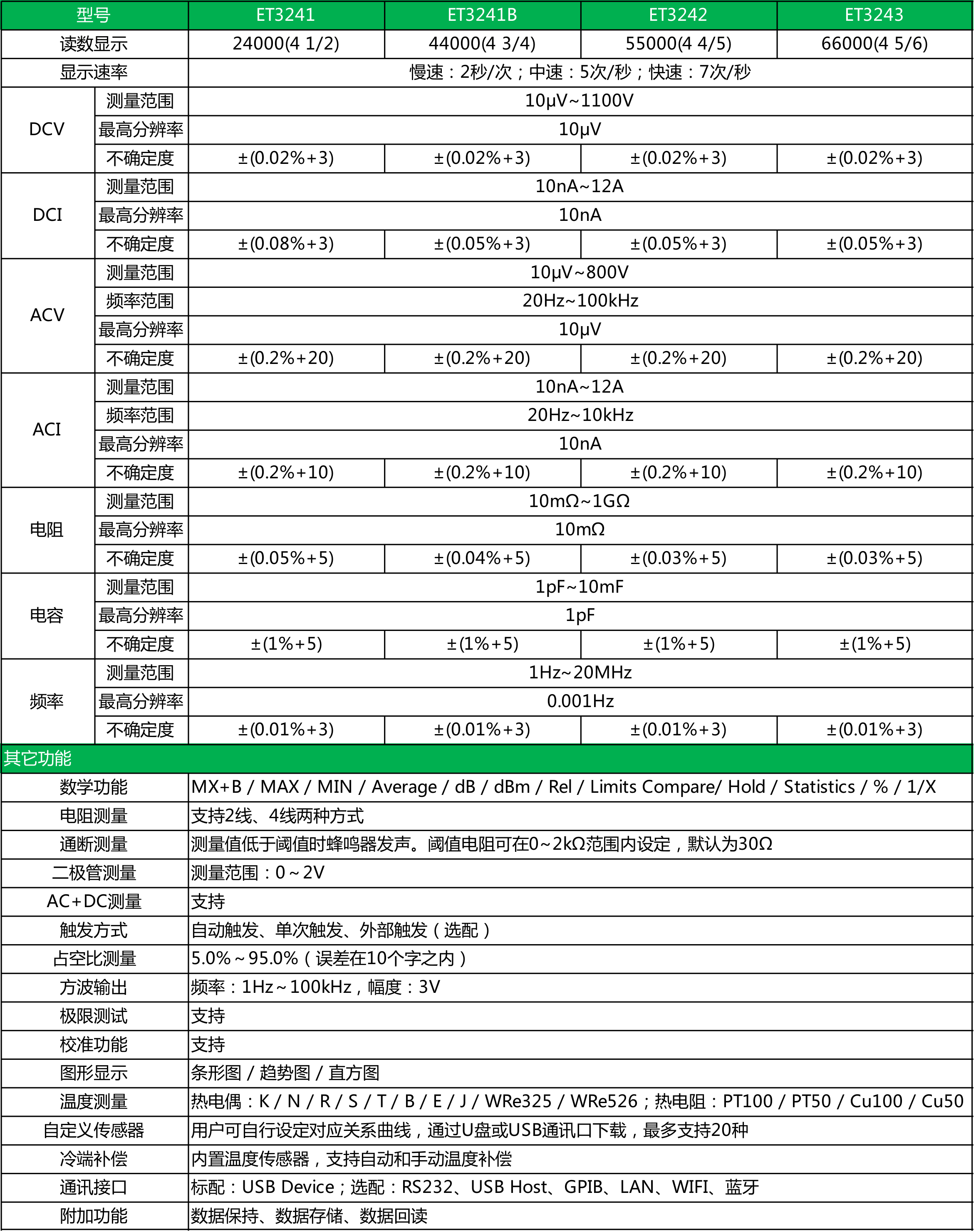 ET324X系列為功能全面、性能穩定的真有效值數字萬用表,本系列臺式萬用表提供強大功能,出色的性能,良好的用戶體驗;3.5寸TFT液晶屏顯示、讀數清晰、內容豐富,具有良好的顯示效果。本表采用市供電驅動使之成為高可靠性數字臺表。全功能、全量程過載保護和獨特的外觀設計使之成為電工以及高校實驗室的首要之選。