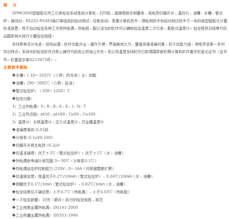 智能化熱工儀表檢定系統,由計算機、打印機、高精度數字測量表、低電勢掃描開關、溫控儀、油槽、水槽、管式檢定爐、接線臺、RS232-RS485接口等組成,檢定各種熱電偶(S、R、B、K、E、J、N、T0、熱電阻(pt10、pt100、Cu50、Cu100)、水銀溫度計、壓力式溫度計、雙金屬溫度計等。